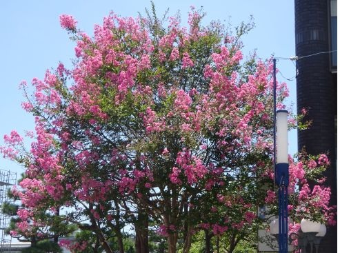7月は、本当に暑かったですね。 夏になると、百日紅(さるすべり)を思いだします。 百日間も花が赤く咲いていることから、「百日紅」と呼ばれているそうです。 細かな花が枝に集まり、一つの大きな花の形を作っています。 赤やピンクや白など様々な色がとても鮮やかで綺麗な花です。 しかし、今年は暑さのためか、有名な本覚寺や本興寺の百日紅がもう既に終了していました。 街角にきれいな花がありましたので、写真にとりました。 一つは、百日紅です。もう一つは、ブーゲンビリアです。 どちらも真夏に適した鮮やかな花です。 朝夕の涼しい時に、街角に植えられている花を巡ってみましょう。 |