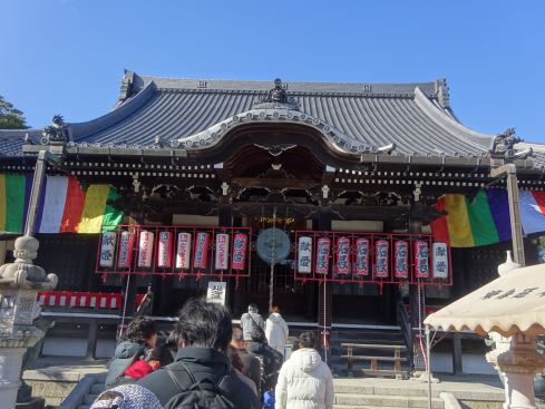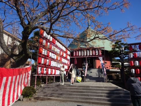 本覚寺と夷堂は、お正月らしく紅白の提灯で飾られていました。